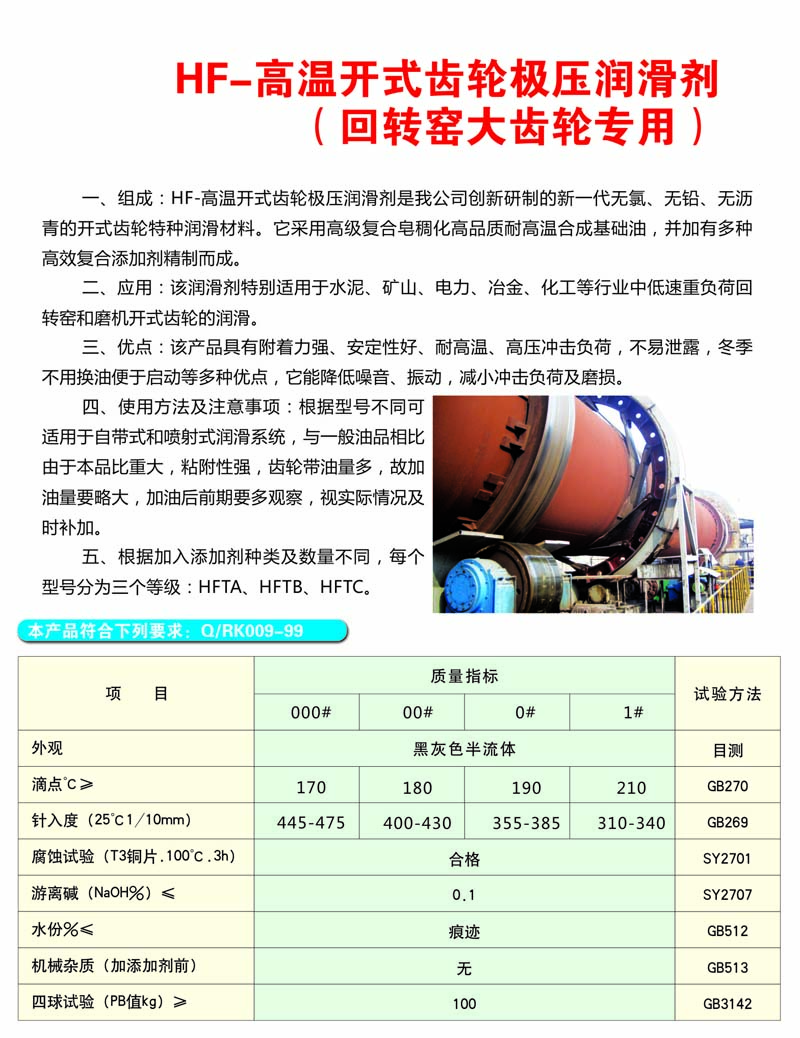 HF-高溫開式齒輪極壓潤滑劑(回轉(zhuǎn)窯大齒輪專用) 簡介:... 咨詢熱線:13603799236 留言給我們 產(chǎn)品詳細(xì) 溫馨提示:舍得重金求產(chǎn)品,不圖便宜買假貨 請(qǐng)認(rèn)準(zhǔn)洛陽市潤康潤滑油有限公司,市場放心的產(chǎn)品。 洛陽市潤康潤滑油有限公司 上一篇:HF-開式齒輪極壓潤滑劑 下一篇:沒有了